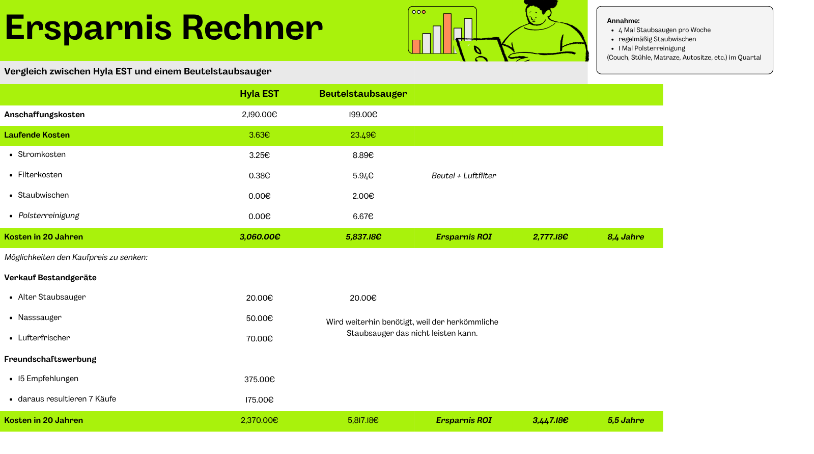 Du sparst Energie und Nerven. Du brauchst keine Angst mehr vor Flecken zu haben. Der Hyla verbraucht 100 Watt (Flüsterstufe) und 730 Watt (Powerstufe) auf 35 Minuten Laufzeit/ Luftreinigung.